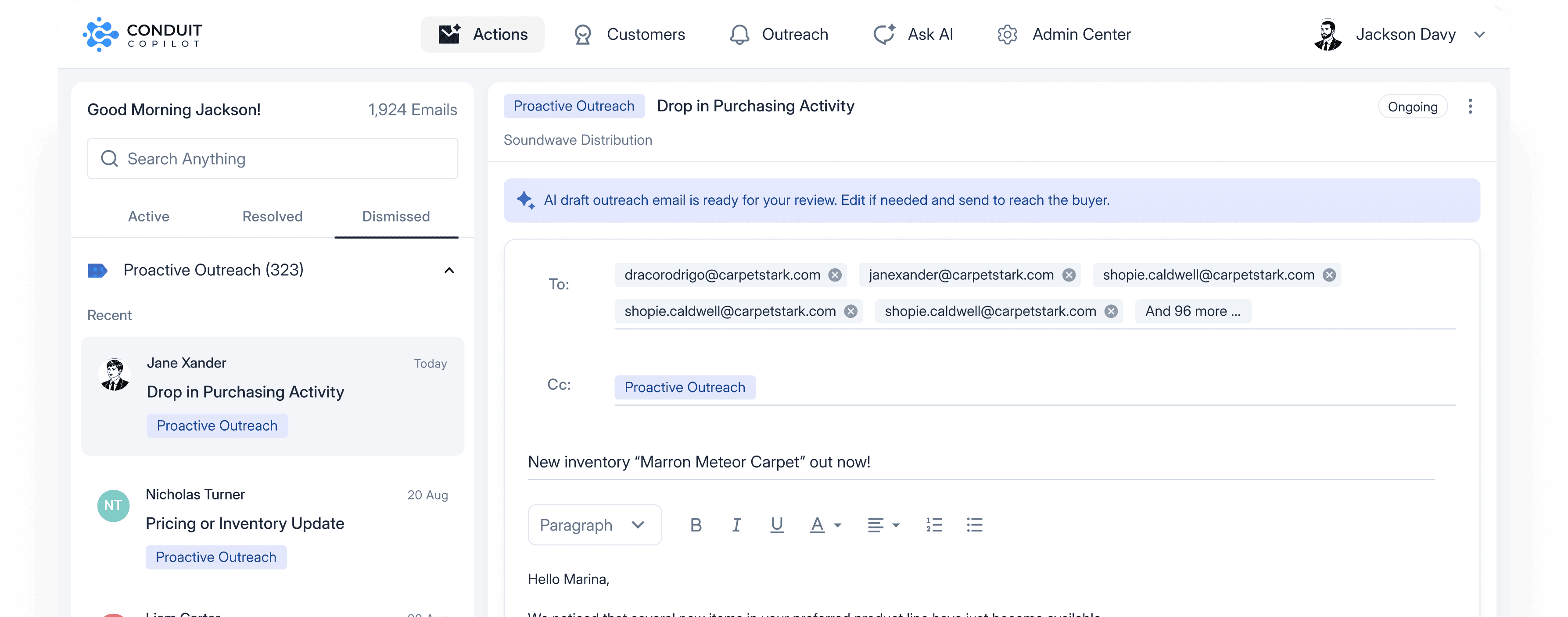 When there's an opportunity (promo, new product, back-in-stock, reorder window), CoPilot drafts the outreach, personalized by account history and buyer profile, and routes it to the right owner (or sends it with your rules).